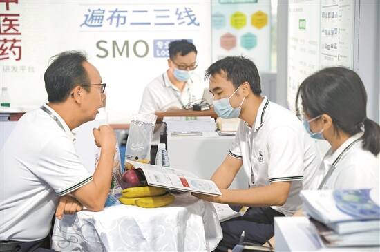 10日,在第十四届中国生物产业大会设置的展厅内,工作人员正讨论最新研究成果