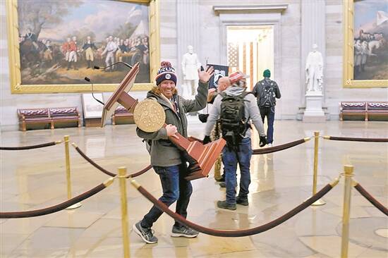 2021年1月6日,美国华盛顿特区,大批特朗普的支持者来到国会进行抗议,其中有人冲进国会内部 图/视觉中国