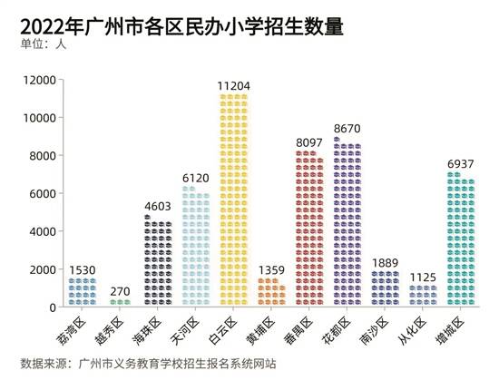 供应方面:2022年广州市11区民办小学共有263所,共招生51804名。较去年的290所减少了27所,招生人数减少13027人。