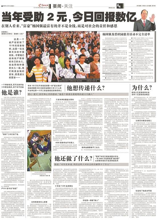 2007年,《瞭望东方周刊》以《一个保守了10年的秘密》为题,首次公开了杨国强先生匿名创立仲明助学金的故事。羊晚晚报也首次公开讲述保守了10年的慈善秘密。