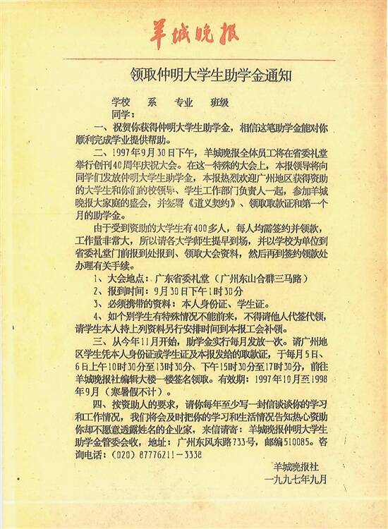 1997年,羊城晚报发出的领取仲明大学生助学金通知