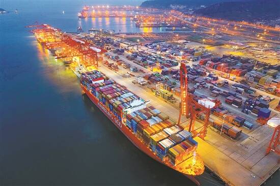 5月22日,一艘大型集装箱船舶正在江苏连云港港集装箱码头装运集装箱 图/视觉中国