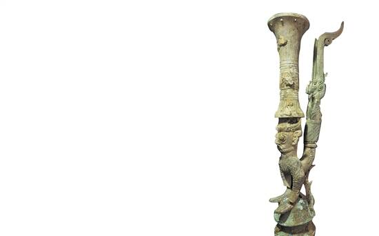 “这不是人像,应当是神像。”现场见证两件文物“合璧”的专家无不惊叹。“合璧”而成的这件鸟足曲身顶尊神像,头顶尊、手撑罍、脚踏鸟,身体向后翻起,完成了一个高难度“动作”,反映了当时祭祀行为中非常重要的仪式、行为。五绺立发的人像造型,与之前三星堆发现的辫发铜人像和髻发铜人像不同,可能代表着三星堆又一种身份的人群。