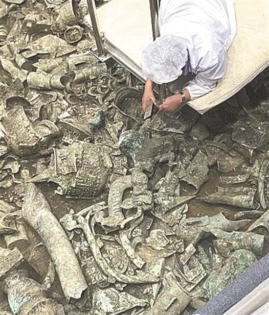 除5号坑和6号坑年代稍晚之外,3号、4号、7号、8号祭祀坑的埋藏年代一致,为商代晚期。迄今为止,3、4号祭祀坑已结束发掘,5、6号祭祀坑整体切割搬迁到文保中心进行实验室考古,正在进行考古发掘的7、8号坑则再度发现大量造型独特的珍贵文物。