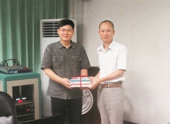 林岗教授(右)向中山大学中文系赠书,由中文系主任彭玉平教授接收 刘程锦 摄