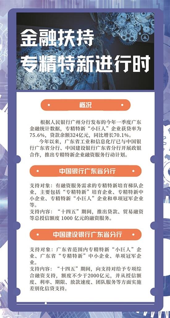记者注意到,今年以来,广东省工业和信息化厅先后与交通银行广东省分行、中国银行广东省分行、中国建设银行广东省分行开展政银合作,“十四五”期间将分别引入3000亿元、1000亿、2000亿元融资支持,累计综合融资金额达到6000亿元。同时,广东省工信厅与中国银行广东省分行、建设银行广东省分行的政银合作,还针对专精特新企业量身打造了一系列融资服务产品。
