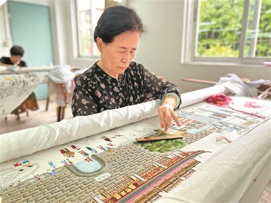 潮绣讲究构图匀称、绣艺精美、针法细腻,在国内外享有盛名。如今70余岁的康惠芳在潮绣之路上耕耘已有50多年,听完总书记的讲话后,康惠芳不断寻找潮绣创新点,持续思索如何用刺绣的语言来表达潮州之美。