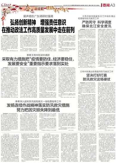王伟中强调,全省已启动防汛Ⅰ级应急响应,要认真落实预案规定,党政主要负责同志要深入一线、靠前指挥,严格执行汛期24小时值班和领导带班制度,充分发挥党组织坚强战斗堡垒作用和党员先锋模范作用,做到守土有责、守土担责、守土尽责、守土有方。要坚持全省一盘棋,统筹调度各地应急救援力量,加强军地协作,及时支援重点地区抗灾救灾,全力保障人民群众生命财产安全。