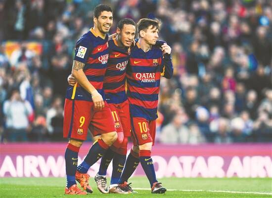 曾一同效力巴塞罗那的梅西(右)、苏亚雷斯(左)和内马尔 图/视觉中国