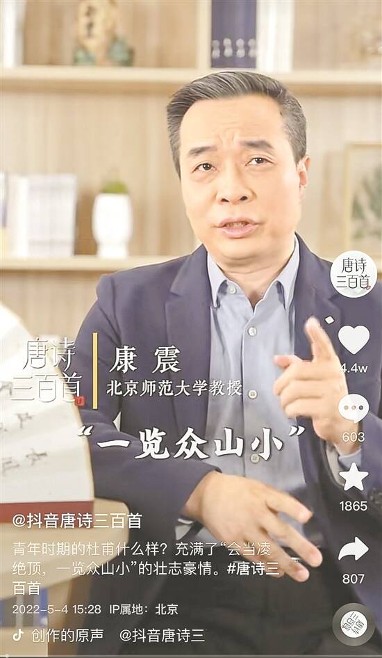 由抖音、南开大学文学院、中华书局、字节跳动公益联合发起的短视频版《唐诗三百首》是最新“出圈”的项目。该项目计划在未来一年内邀请多位专家学者讲解和诵读313首唐诗。目前已参与录制的包括中央文史研究馆馆员、南开大学中华诗教与古典文化研究所所长叶嘉莹,北师大文学院教授康震,历史学者纪连海等专家学者,正式上线的短视频超过80支。