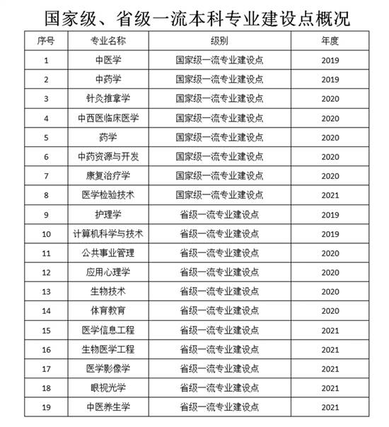 2017年学校以中医学入选国家“双一流”学科建设高校,2018年晋级广东省高水平大学重点建设高校,2020年成为广东省人民政府、教育部、国家中医药管理局共建单位,2021年再次以中医学入选国家第二轮“双一流”建设高校及建设学科名单、广东省新一轮高水平大学重点建设高校。