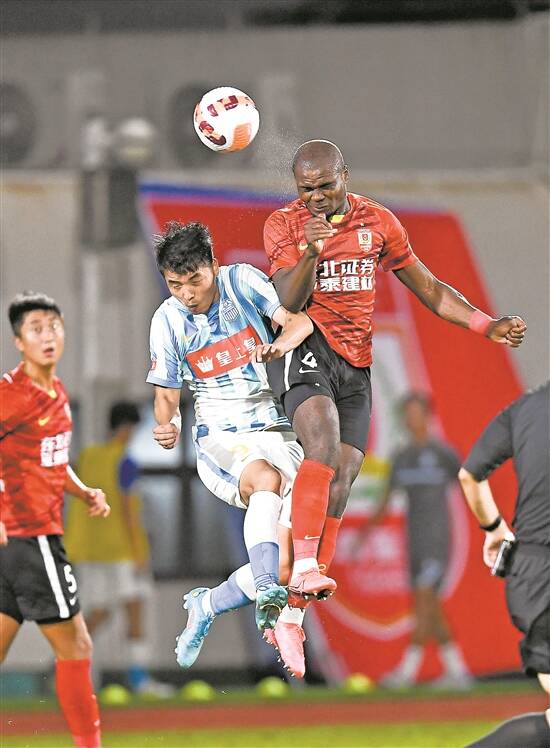 长春亚泰队球员奥克雷(右)与广州城队球员桂宏在比赛中争顶 新华社发