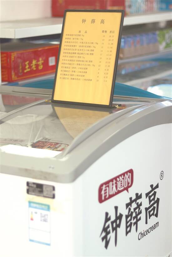 詹女士在广州市天河区的某小区内经营着一家小卖部。从5元以内的小布丁、绿舌头、冰工厂、奶提子,到接近10元的好阿婆、李大橘,再到十几二十元的钟薛高、喜茶,基本按价格排列、整齐地躺在门口的两个冰柜里。
