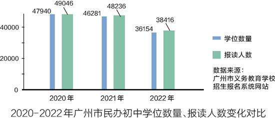 需求方面,据广州市教育局公布的数据显示,今年填报民办初中志愿的适龄儿童共38416人,去年报名人数则为48236人,相比减少了9820人。供应方面,今年民办初中数量减少了33所,招生数量减少10127人。而在2021年,民办初中招生学校较上年(2020年)减少10所,招生总数减少1659个,报名人数减少810人。