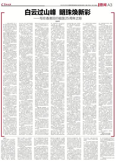 1997年-2022年,四分之一个世纪,时间见证前行:香港经济持续蓬勃发展,国际金融、航运、贸易中心地位不断巩固,香港居民享有前所未有的民主权利和自由,各项民生事业大幅改善……白云过山峰,明珠焕新彩。走过25年不平凡的历程,这座欣欣向荣的城市,正在新时代续写狮子山下发展新故事、繁荣新传奇。