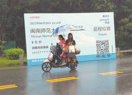 6月中旬,在福建漳州闽南师范大学校园行健桥的出入口旁,竖起一张巨型“火车票”——