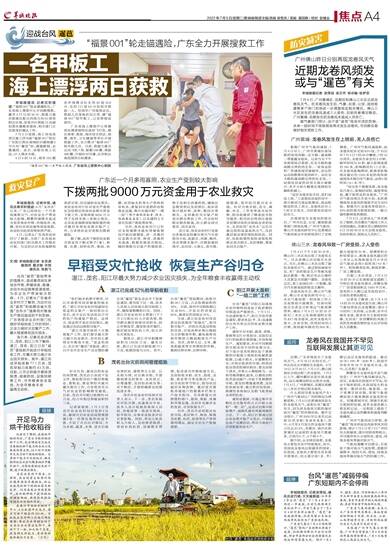 羊城晚报讯 记者梁怿韬,通讯员梁巧倩、王天巍报道:今年第3号台风“暹芭”于7月4日在广西进一步减弱,目前已很难确定其环流中心,中央气象台于7月4日8时对其停止编号。“暹芭”虽然减弱停编,但其残留云系结合西南季风依然为广东制造风雨。
