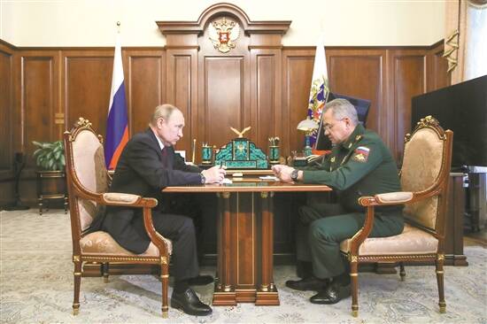 俄罗斯官方公布的照片显示,国防部长绍伊古在向普京汇报工作 图/人民视觉