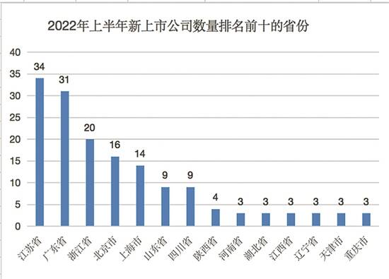 另从上市公司所在地来看,新上市企业主要出自对科技创新企业及新兴产业大力扶持的省份。羊城晚报记者梳理发现,江苏省以34只新股融资421.16亿元排名首位,广东则以31只新股融资352.49亿元位列第二,此外,浙江省、北京市、上海市新上市公司也都超过了10家。