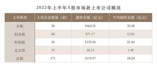同花顺ifind数据显示,截至6月30日,今年上半年A股171只新股融资3119.37亿元,而去年上半年有259只新股融资2139.94亿元。虽然今年上半年上市企业数量减少三成,但融资规模上升46%。