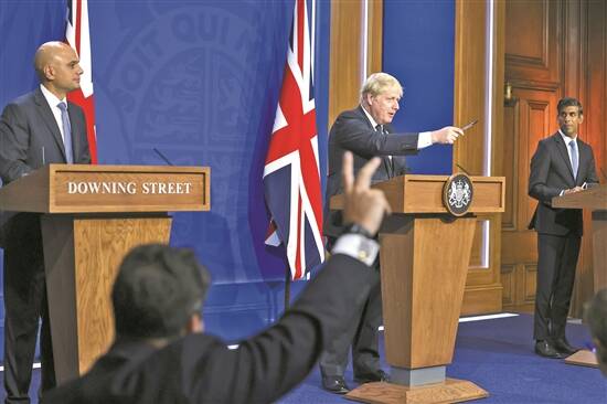 去年9月7日,英国首相约翰逊(中)、卫生大臣贾维德(左)和财政大臣苏纳克在伦敦出席新闻发布会 新华社发