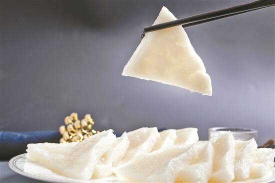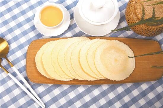 最传统的云片糕是用咸淡水交界的糯米制作而成,工艺繁复,其外观雪白,薄如书页,拿在手里感觉柔软但有黏性,可以一片片撕开,吃到嘴里细腻、甜、糯、香、酥,又因糖油充足,可以用火点燃。此外,还有玫瑰云片糕,带着淡淡的玫瑰香味。想当年,许多华侨同胞一下火车就会买深圳云片糕,在小小的云片糕里寻找久违的乡愁。