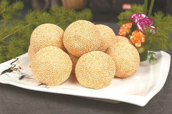 煎堆的样子和我老家的麻团有几分相似,它最初起源于顺德龙江,用糯米粉做皮,炸至金黄,表皮匀布芝麻,馅料甘蜜味浓。“煎堆碌碌,金银满屋”,在煎制的过程中,它会越变越大,颜色由浅黄,变成深黄,最后变得金光灿灿,意头很好。我在顺德一家农家菜馆吃过最大的煎堆,篮球一般大小,一上桌,大家兴奋不已,像孩子一样欢呼起来。