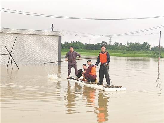 7日上午,家住该村低洼处的一名女子因刚做完手术,行动不便,和照顾她的丈夫被困家中。眼看着暴雨越来越大,家里积水越来越高、已漫过胸口,情况危急,于是报警求助。茂名市公安局电白分局刑侦大队民警闻讯赶来救援,在200米外的沙琅江找来排筏,涉水撑筏,成功将这对夫妻安全转移出来。据了解,当天该局刑侦大队20余名警力协助霞洞镇安全转移受灾群众41人。