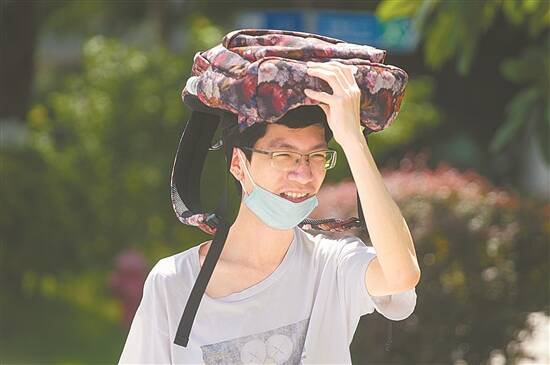 广州一市民用书包遮挡午后阳光 梁怿韬 摄