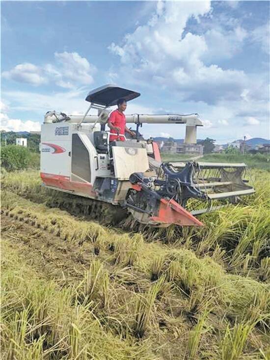 黎绍希开着收割机在田里收割早造水稻