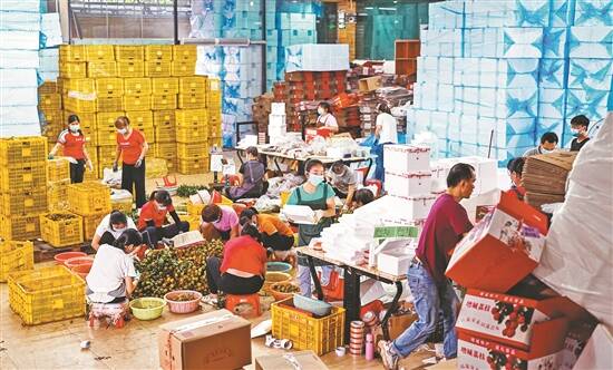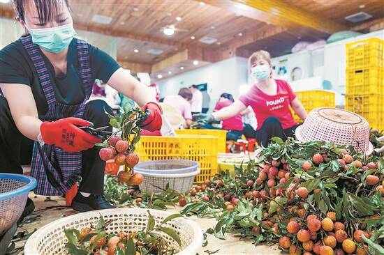 荔枝销售旺季,公司装配区热火朝天,人工精选、剪枝、装箱、发货的工作从早忙到晚