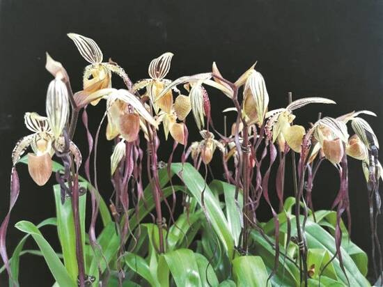 一株株婀娜摇曳的兜兰,在华南国家植物园的花圃中绚烂生长。
