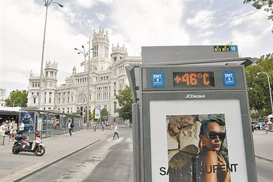 6月18日,西班牙马德里西贝莱斯宫附近一处公交站显示实时气温达46℃ 新华社发