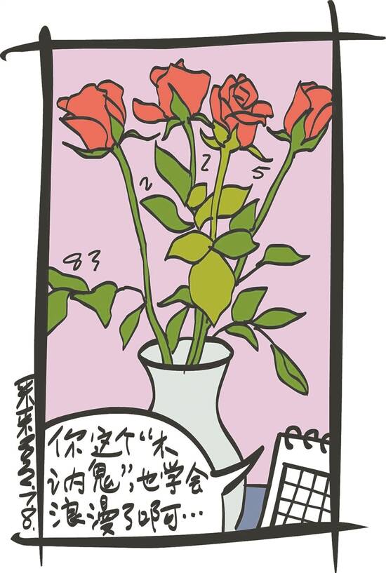 老伴儿买菜回到家,一改往日对老侯的视而不见:“我说你这个‘木讷鬼’,也学会浪漫了啊?”老侯假装不解,老伴儿使劲擂了他一拳:“你少装了,今天是咱们的结婚纪念日,你这不都买花来祝贺了嘛!”瓷瓶里插着火红的玫瑰,让她越瞧越喜欢:“为了表扬你的‘开化’,等下我弄几个你爱吃的菜,也允许你整点儿小酒……”