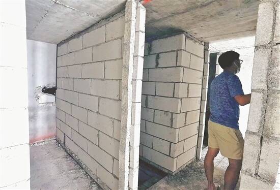 为了求证肖女士的说法,7月14日,记者来到了合景天峻小区。记者乘坐电梯上到16楼发现,多套房子已被施工人员用混凝土或钢结构改建成2层4小间(毛坯)。该房为了有效利用空间,进门口被改建成楼梯,住下面的从左右两侧进入,住上面则需爬楼梯。由于空间太小,记者只能侧身进入,站在几平方米屋里,头离楼顶约40厘米,让人感觉特别压抑。