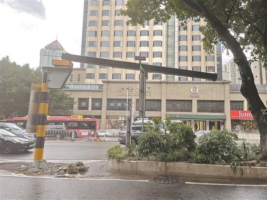 环市东路区庄立交路段受损的龙门架已设置警示灯 羊城晚报记者 严艺文 摄