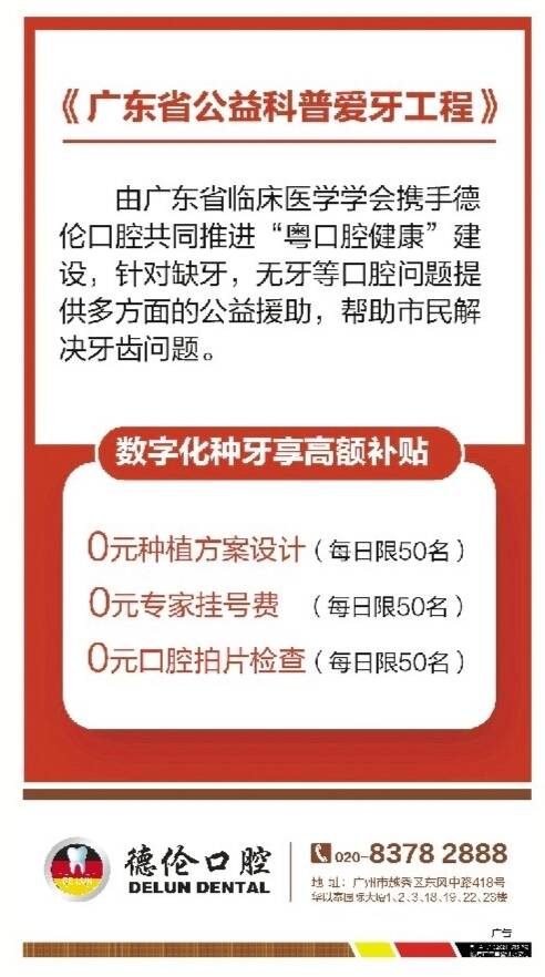 为进一步倡导世界卫生组织8020计划,提高市民生活质量,推进“粤口腔健康”建设,进口种植牙980元起/首颗,单颗缺牙、多颗缺牙、全口无牙等市民均可拨打020-8375 2288申请领取,名额仅限100名,取完即止!
