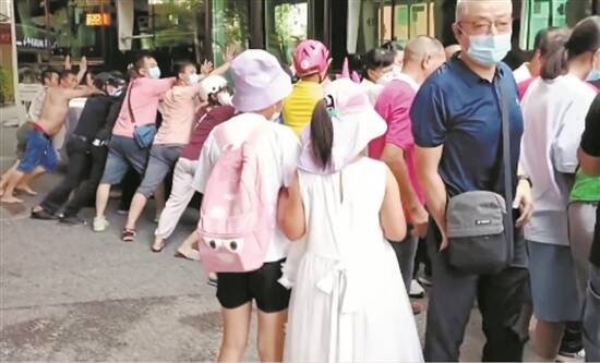 据附近一家小吃店的工作人员介绍,很快四面八方的人都聚拢了过来,有经过的路人、附近商铺的店主、吃早餐的顾客、外卖骑手和快递小哥……数十人从车头站到了车尾,其中,有四五个年轻人试图想把车轮子抬起来,其他街坊也很快配合起来,大家开始一起喊口号“1、2、3”合力抬车(见上图)。