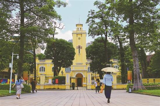 再往前走,会看到一栋暖黄色的建筑。这座被称为“钟楼”的建筑,不仅是中国国民党“一大”会议旧址,也是鲁迅1927年在中山大学任教时进行革命活动的重要场所。钟楼建于1906年,是废除科举制度后在广东贡院旧址上建立起来的两广优级师范学堂主楼,此后历经国立广东高等师范学校、国立广东大学、国立中山大学、广州鲁迅纪念馆等沿革,承载了广东近代高等教育的历史。