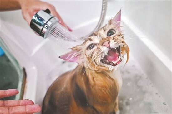 给猫洗澡时,店员会不停地与猫进行感情交流,保持宠物情绪稳定