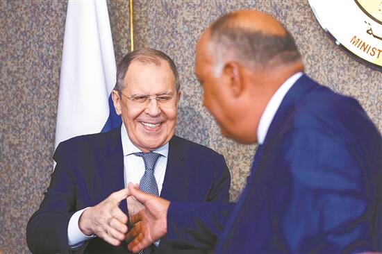 当地时间7月24日,俄罗斯外长谢尔盖·拉夫罗夫(左)和埃及外长萨迈赫·舒凯里在埃及外交部大厦举行的联合新闻发布会上握手 人民视觉供图