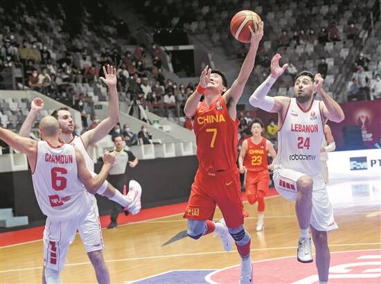 孙铭徽(左三)在对阵黎巴嫩队的比赛中上篮 新华社发