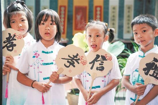 吉山村:友竹家塾里的小学员,拿着“孝”“信”“礼”扇子