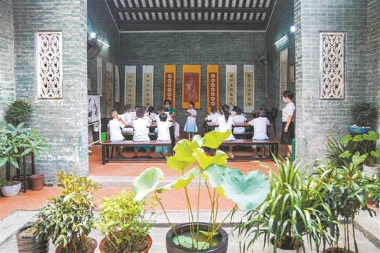 伴随着悠扬的古曲《高山流水》,孩子们专心致志地画画。阳光从天井洒下来,荷叶随风晃动。外面烈日炎炎,书塾内独享一份清凉。友竹家塾坐落在池塘边,周围是连片的祠堂、私塾等传统建筑。门楣上的刻字显示,其始建于咸丰年间,后被认定为天河区登记文物保护单位。