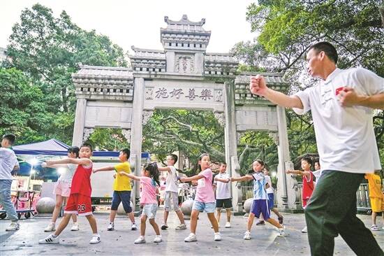 龙潭村:海珠区龙潭村“乐善好施”牌坊下,“欢迎小候鸟”夏令营的孩子们在练习咏春