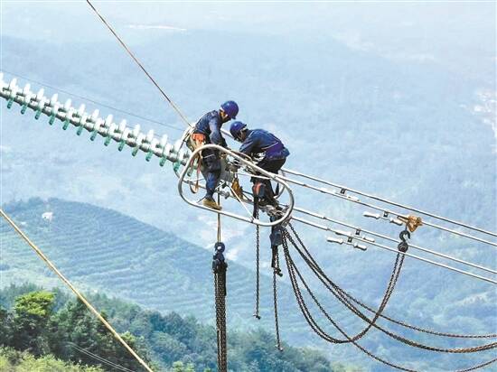 羊城晚报讯 记者马灿、通讯员沈甸摄影报道:在广东梅州与福建漳州连绵的山岭间,铁塔林立,银线穿梭。29日,在闽粤两省交界的电网塔基上,随着最后一根导线塔架设完毕,闽粤联网线路主体工程全部完成,标志着闽粤联网工程实现全线贯通。
