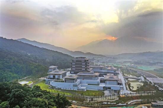 何镜堂:首先,要体现中华传统文化的底蕴。广州国家版本馆背后是凤凰山,前面是流溪河。广州国家版本馆整体布局依山就势,层次递进,传承中华传统礼轴形制。我们借鉴了中国传统殿堂式建筑的风格,体现出很强的空间序列感,其中有一个很重要的元素——中轴线。建筑群顺着一条清晰的主线延伸而去,与名山绿水环抱交融。