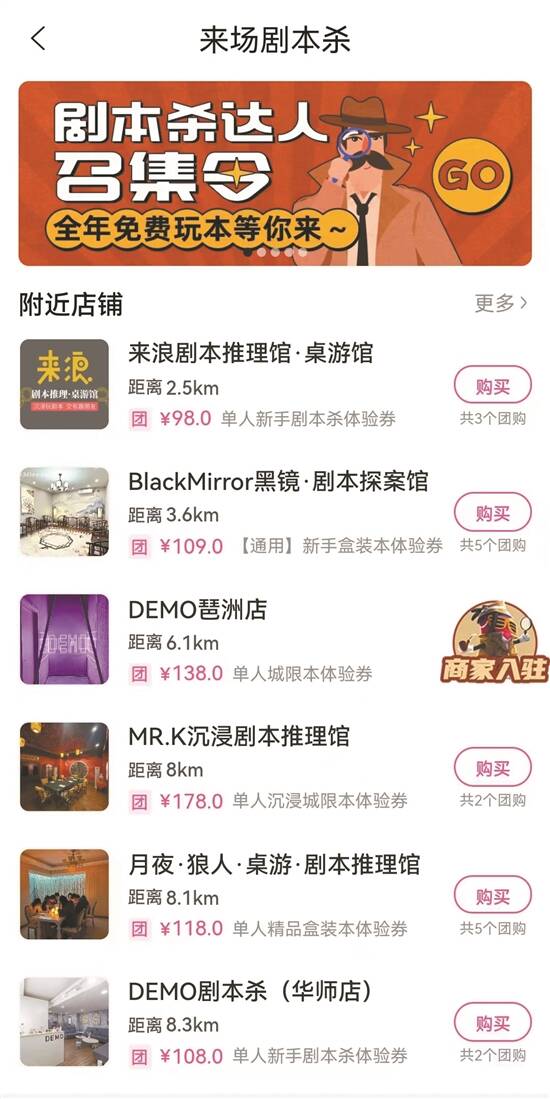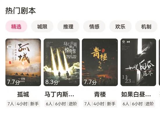 截至目前,平台已覆盖北京、上海、杭州、广州、成都、武汉、苏州等40个城市2000家剧本杀门店,上架《第七号嫌疑人》《年轮》《一座城》《来电》等高分剧本杀IP7000个。