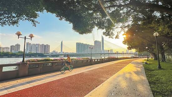 二沙岛环岛碧道“南岸工程”开放后,市民游客多了一个“打卡”海印桥日落的视角