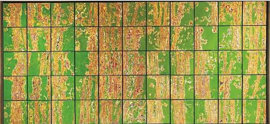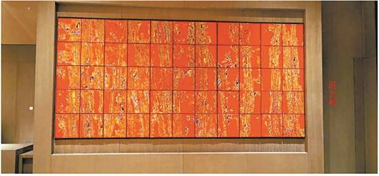 前者表现一片翠绿色的树肌理,抽象生动刻画祖国大地生机勃勃,四季如春;后者延续《春华》的繁华与生机,以红色为主调,色彩饱和度更高,寄寓着新时代的红红火火。